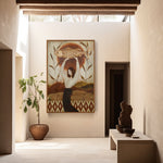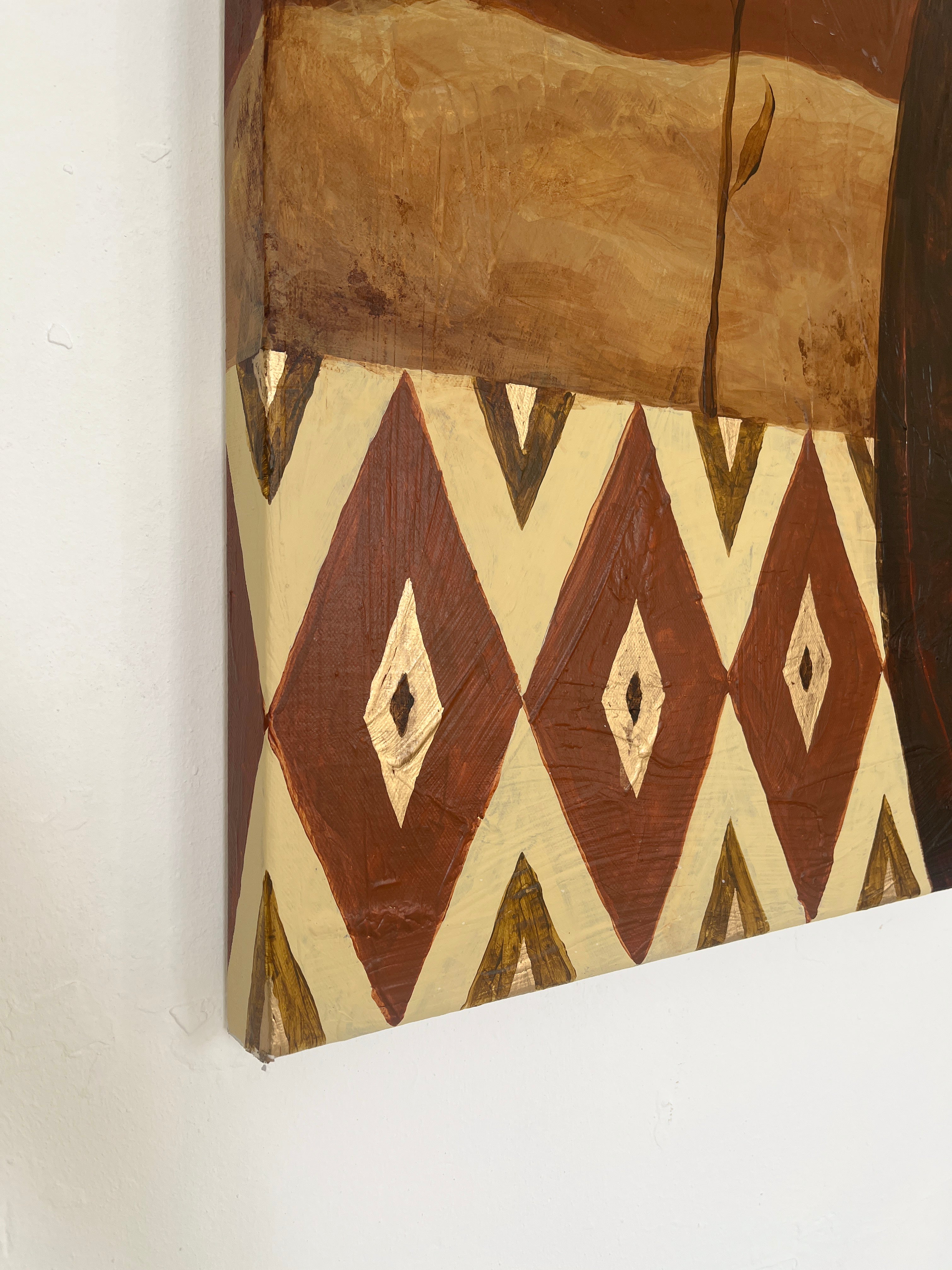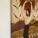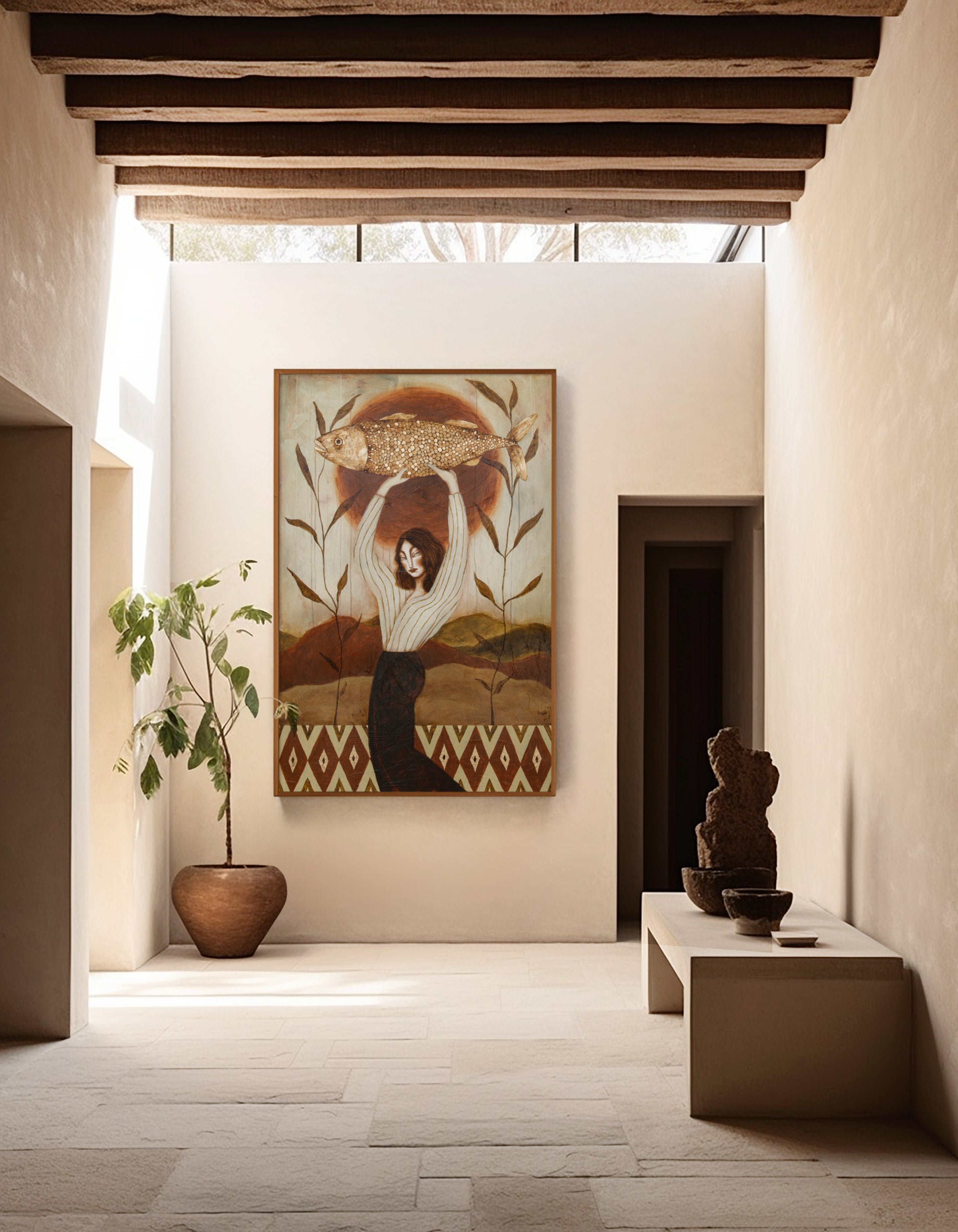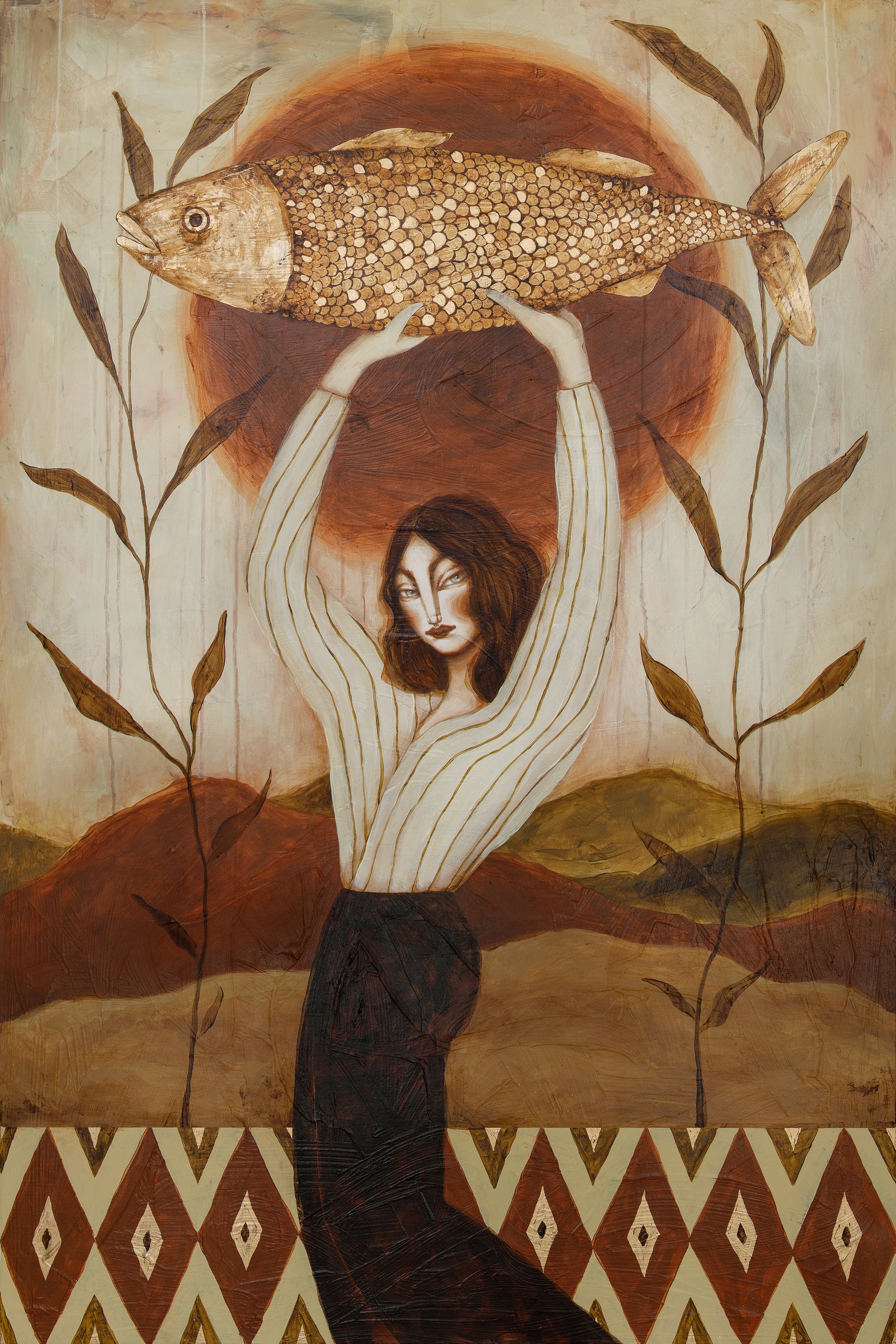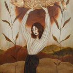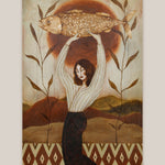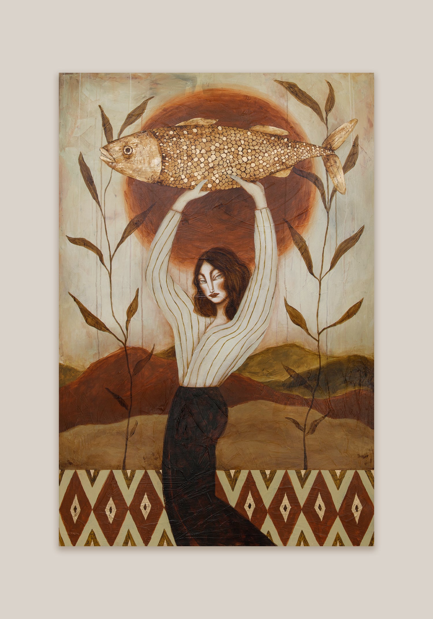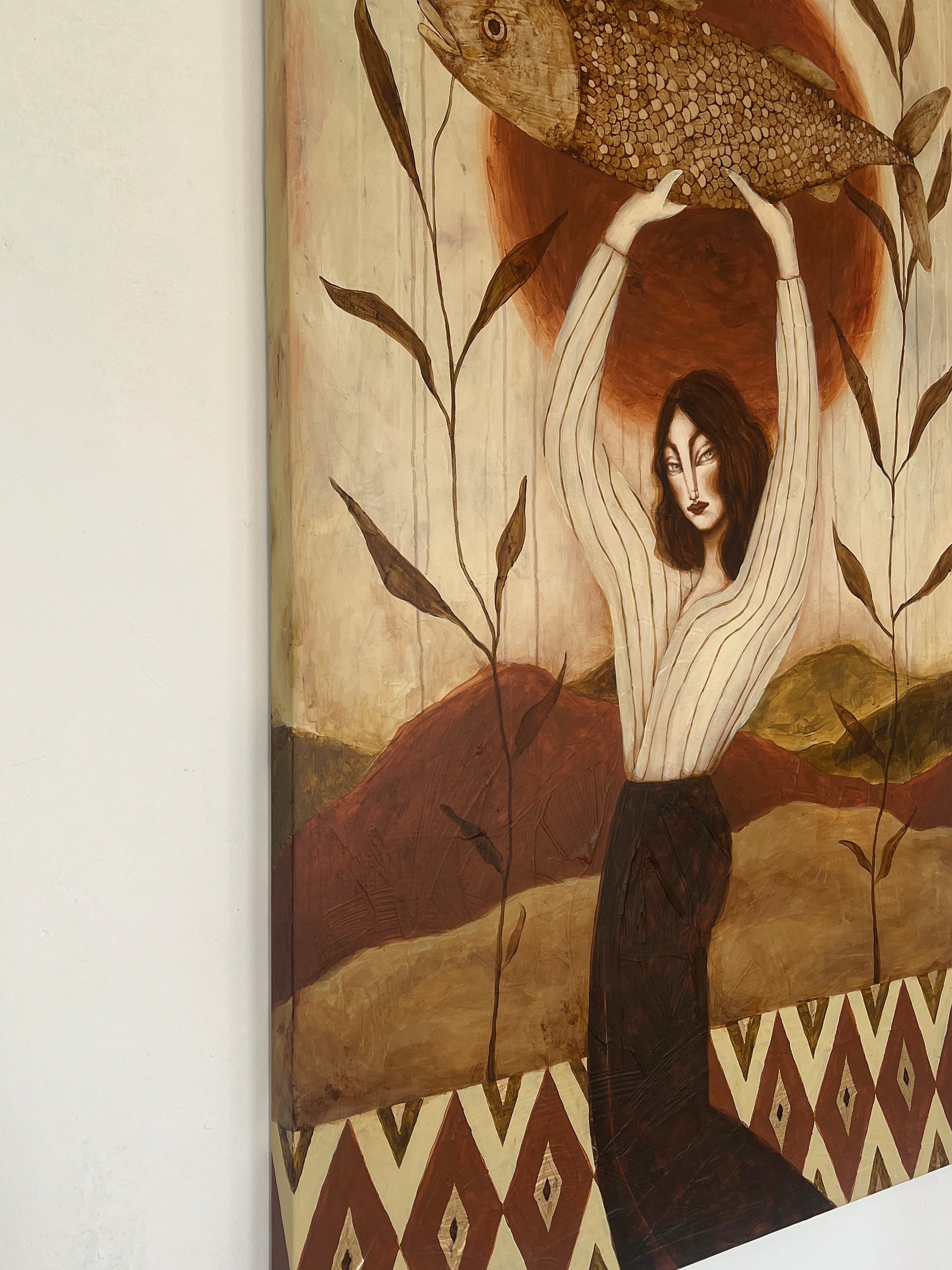 BIRTHDAY explores the moment of emergence - when something rises into being. Mountains lift from the ground, the sun ascends from darkness, and a woman raises a fish as an offering of life. Everything in the composition moves upward, echoing growth, renewal, and transformation. The fish, a recurring symbol of rebirth, fertility, abundance, and transition, becomes both weight and gift - held aloft at the threshold between night and day. This is a painting about beginnings: the quiet force of creation, and the moment when something new is birthed.